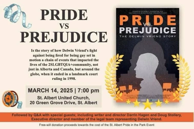 Come celebrate PIE Day with the St. Albert United Church on March 14 for a screening of Pride vs. Prejudice with a special talkback following the film featuring Darrin Hagen (Writer/Director) and Douglas Stollery (Executive Producer).